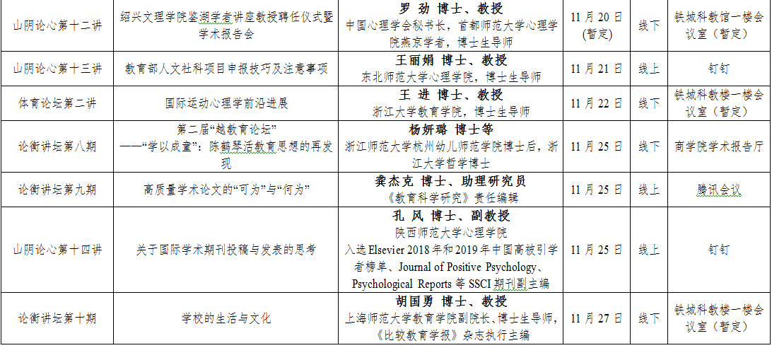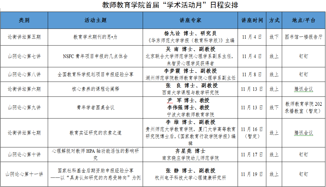 教师教育学院开展首届“学术活动月”,进行教育学、心理学、体育学三大一级学科的学术和经验分享,采取线下与线上相结合的方式进行。