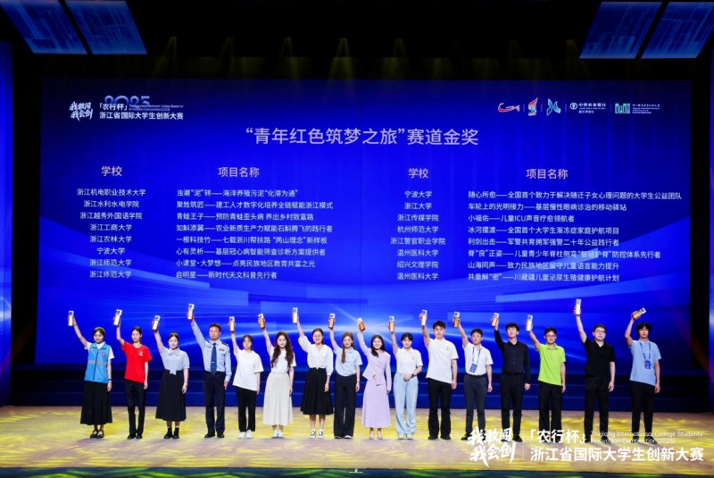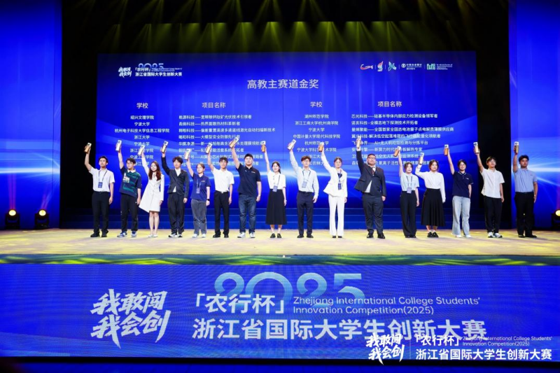 7月11-13日,“农行杯”浙江省国际大学生创新大赛(2025)决赛在浙江机电职业技术大学圆满落幕。本届大赛以“我敢闯,我会创”为主题,吸引了全省100多所高校、5.9万个项目、43.9万青年学子积极参赛。省教育厅总督学陈仁坚,省农行党委委员、副行长胡隽等出席闭幕式并为获奖团队颁奖。