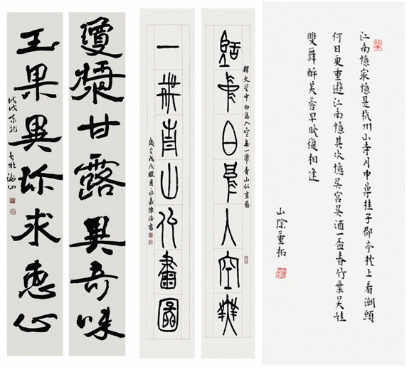 兰亭书法学院部分学生作品正在市区张桂铭艺术馆展出。卜泰龙,《魏碑对联》;陈浩,《七言金文联》;董拓,《忆江南》(从左到右)。