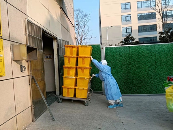记者了解到,运送这些医疗废物箱的,是该院的医务人员,其中不乏一些专家教授。自12月7日绍兴市突发新冠肺炎疫情以来,全市已累计报告确诊病例387例,均收治于该院。面对保洁人员紧缺的现状,医务人员主动承担起医疗废物处置、卫生保洁、消毒消杀等工作。