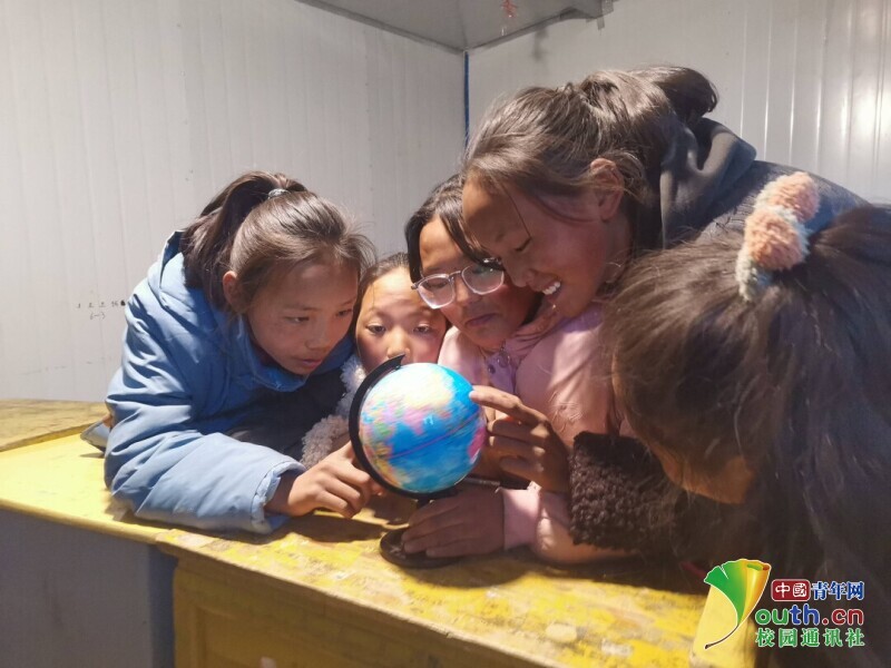 图为藏族学生在认识地球仪。中国青年网通讯员 徐琳峰 供图。