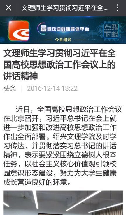 全国高校思想政治工作会议以来,我校多种形式多个层面学习贯彻习近平总书记在全国高校思想政治工作会议上的讲话精神。12月13日的《绍兴日报》头版、12月14日的《今日绍兴》、12月15日的《绍兴新闻联播》连续报道我校学习贯彻习近平总书记重要讲话精神情况。