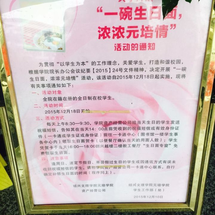 “生日快乐!学院为你准备了一份祝福,请你于今天14时前到一卡通中心领取生日面贺卡,16时至18时到兴越楼‘生日面专窗’领用生日面。”昨天一大早,医药与健康系的李好好收到这样一条短信,同一时间收到的还有其他28位学生。