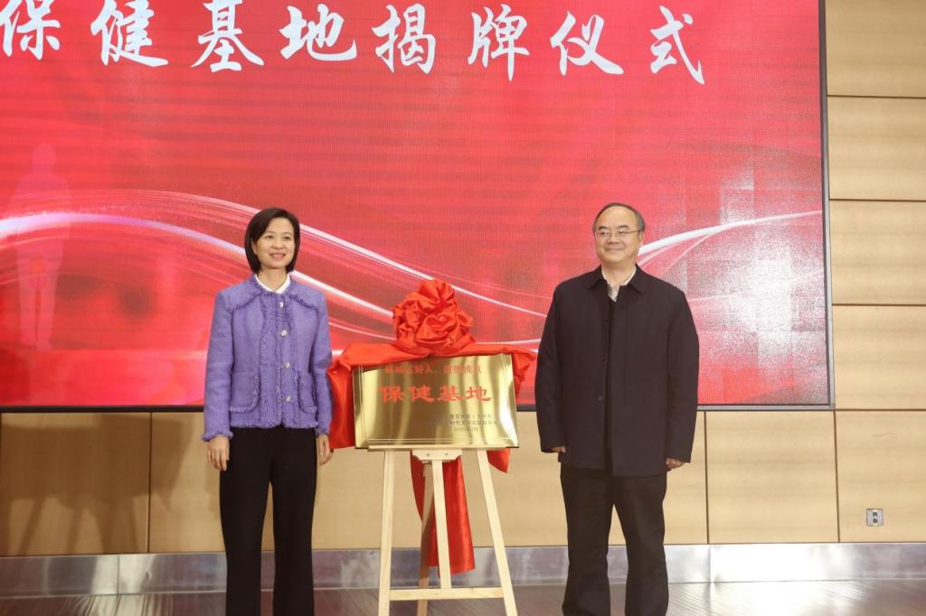 黄坚,吴萍共同为保健基地揭牌。