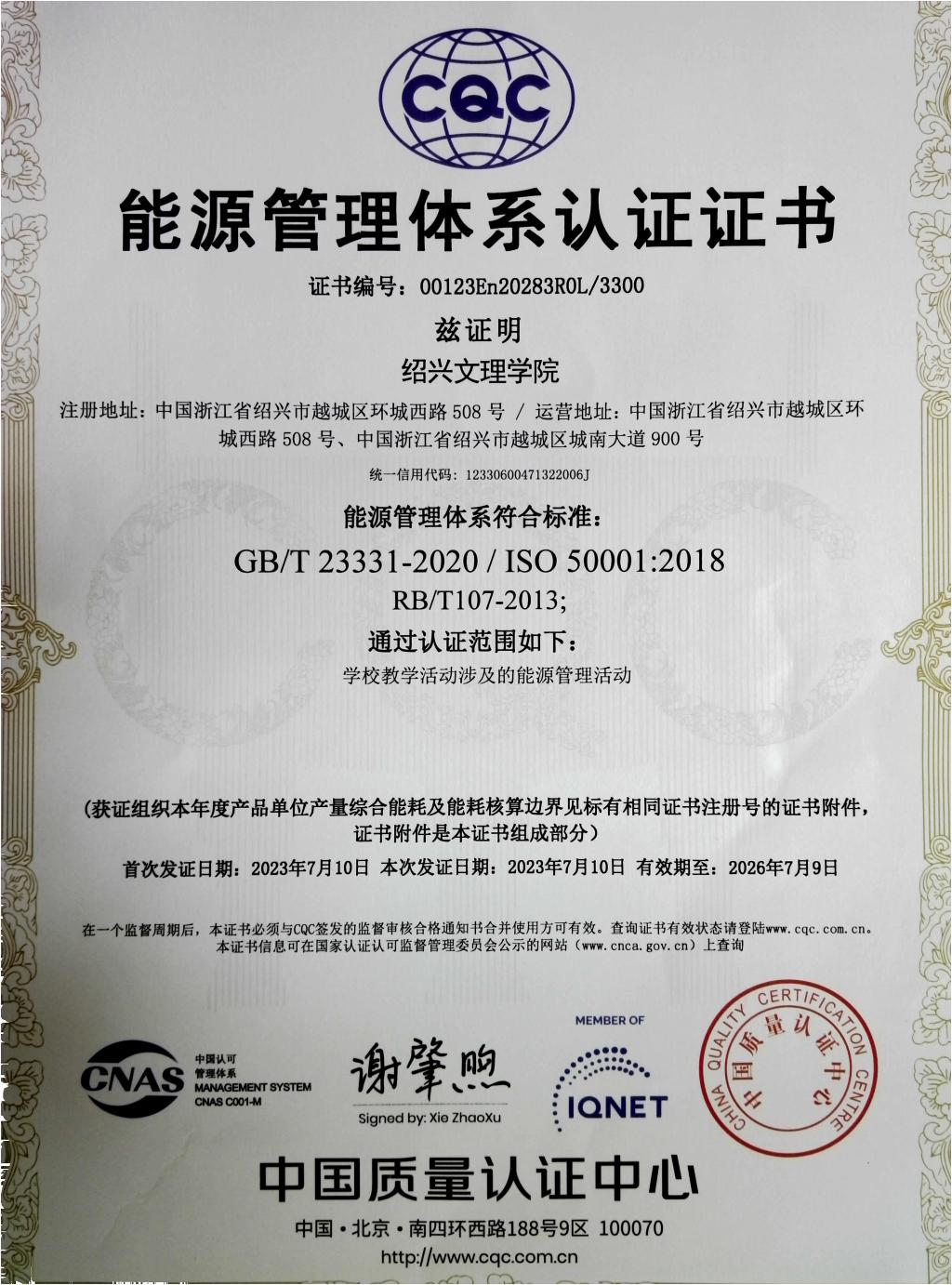 近日,我校收到中国质量认证中心颁发的能源管理体系认证证书,标志着我校的能源管理体系建设符合国家标准。
