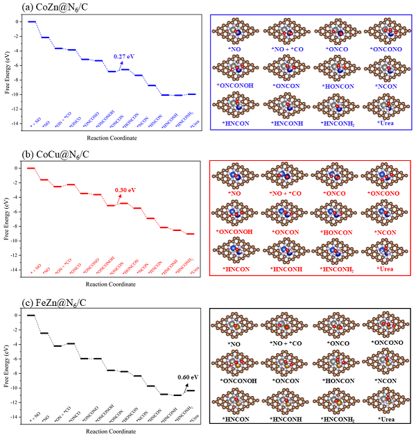 当前尿素是通过CO2与NH3在高温高压条件下合成的, 这一过程不仅耗能极大且不环保。因此, 探索高性能的电催化剂在常温常压下用于尿素合成具有重要意义。在这个工作中, 基于密度泛函理论计算, 作者构建了一系列双原子催化剂, 以两种气体污染物(NO 与CO)作为N 源与C源进行C-N偶联产尿素。结果表明稳定吸附的NO 与CO 能够促进C-N 偶联以及连续的氢化反应。通过筛选, CoZn, CoCu, and FeZn@N6/C 催化剂能够持续的接受质子/电子对, 实现尿素的生成, 分别表现出−0.27, −0.30, 和 −0.60 V 的过电位。同时尿素产生是遵循 alternative 机制 。此外, 引入溶剂化效应与恒电势模型探索了在真实反应条件下C-N耦合动力学能垒, 只有0.75 eV。竞争性反应如HER 与NRR 也得到了很好的抑制。因此表现出产尿素的高选择性在这三种电催化剂上。