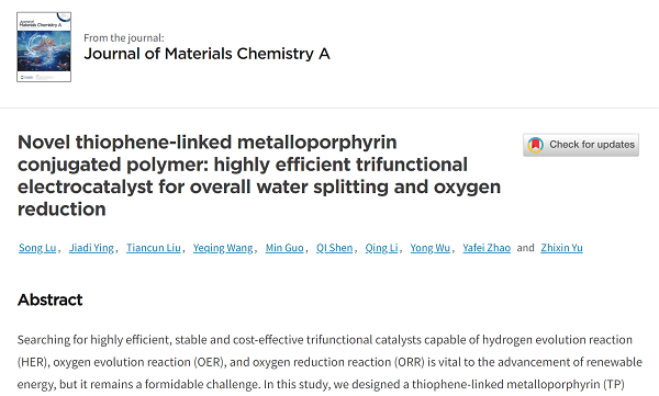 开发高性能的HER/OER/ORR电催化剂用于水分解产氢以及燃料电池具有重要意义。在这个工作中, 通过密度泛函理论计算预测了一种新型的卟啉(以噻吩作为连结剂)催化剂。得到了Co, Rh 和 Ir-N4/TP 催化剂表现出对OER/ORR低的过电势。其中Co-N4/TP表现出 0.07/0.24/0.42 V过电位, 能够作为一种三功能催化剂用于水全分解和氧还原反应。反应动力学能垒表明Co-N4/TP遵循Volmer-Heyrovsky 机制。此外, 在这三种催化剂上, 二电子反应产物H2O2 也能够被抑制。催化剂的稳定性通过结合implicit solvent 与constant potential methods 来评估。结果表明在实际工况下-1.50 V (vs. RHE), 金属原子并不会发生团聚, 表明了优异的稳定性。在活性起源方面, 金属中心的氧化, 体系磁性与OER/ORR催化活性密切相关。最终通过机器学习对本征性质进行优化, 得到d 带中心与HER 性能相关, 但在OER/ORR, 每个中间产物对应的本征性质是变化的。